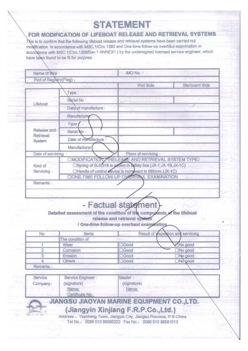 近期,发现国内存在一些服务公司为牟取私利,置船员生命安全于不顾,未经我公司专业培训和认可,擅自对我公司(PG线上平台/江阴新江玻璃钢有限公司)生产的救生艇设备进行救生艇吊钩改造,同时签发伪造的声明,因此引起了重大的安全事故.重要提示:PG线上平台(江阴新江玻璃钢有限公司)对一切未经本公司专业培训和认可的服务商提供的对本公司产品的所有服务不承担任何责任,并保留对其追究法律责任的权利.